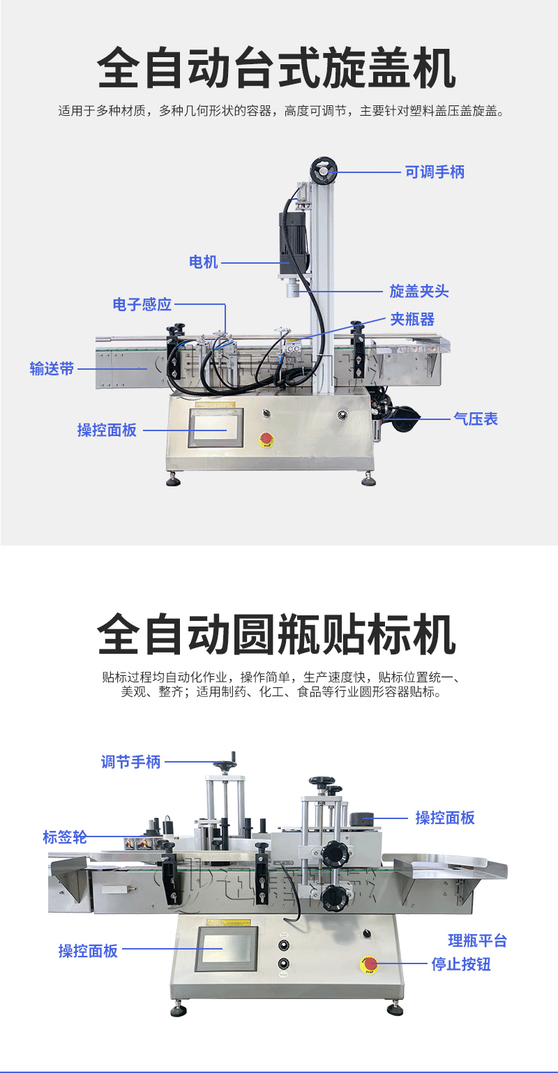 本設備主要適用于食品、日常化工、農藥、醫藥和特殊行業。灌裝精度將受氣壓的穩定性、物料的均勻性、灌裝速度等的影響。 產品說明:生產線根據灌裝范圍選擇型號,灌裝部分為雙頭下潛式灌裝機,適用于不同物料不同瓶子的灌裝,配備自動壓蓋機和圓瓶貼標機,可實現不同蓋子的旋蓋貼標工作。